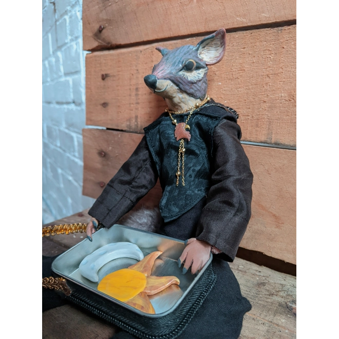 Materials used: polymer clay, wire, vintage hankies, fabric scraps..