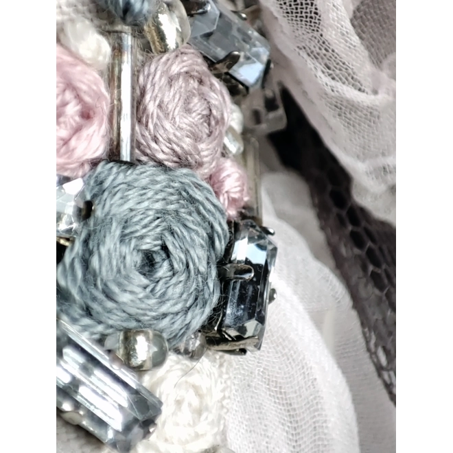 The outfit is made of silk and tulle. The corset is decorated with vintage crystal chatons and designer rose embroidery.