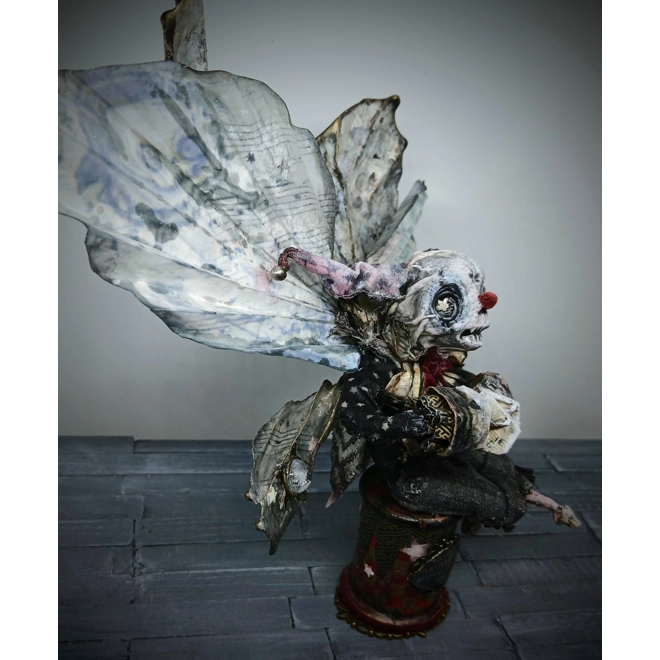 Bellow is a mixed-media sculpture, created with clay, resin, fabric, paper, wire, beads, a vintage cotton spool, vintage music sheets, vintage tiny bells, acrylic paint and metal findings. His wings are a mix of paper,with my drawings on, vintage music sheets, wire, and resin. He is 24 cm tall and his wings span 30 cm wide.