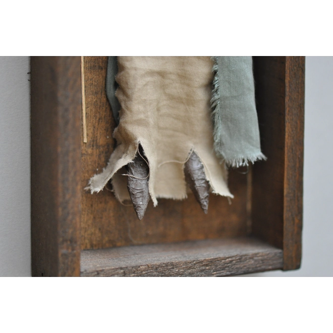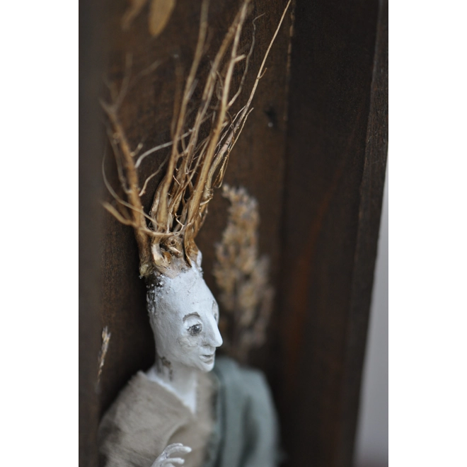 Materials used: air-drying clay, wire, textiles, paper, watercolour paint, gold wax, dry plants, wood