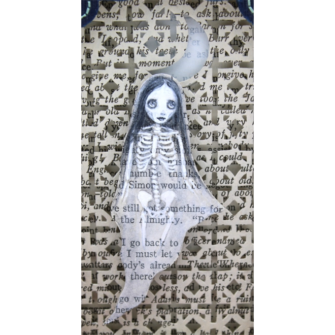 "When I found this little book I knew it would be the perfect one to use for this show. She is part of an on going series of Ghost Confessionals. The elaborately cut back ground is reminiscent of old confessional screens. The ghost is painted on a page of the book from the story "Kari Aasen in Heaven" with the words "But your body's already buried, so you will always be invisible". How much more ghostly could you get? The hand embroidery on the cover uses four different colors of vintage thread. The pale green turning to gray represents the passage of life to death. The green to yellow is the transition of death to spirit."