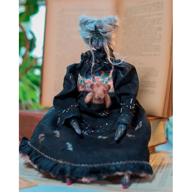 "This Black Unicorn Witch doll is a keeper of stories. Dressed in a worn black gown embroidered with tiny beads, she carries in her pocket a small, timeworn teddy bear — her faithful companion in silence.